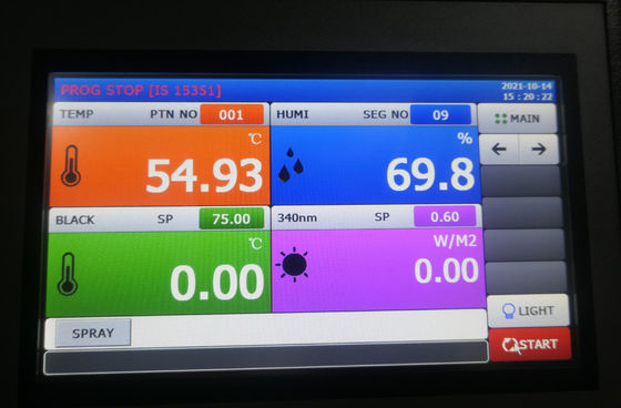 2. Layar sentuh berwarna, menunjukkan kondisi ruang secara real-time, dapat mengatur radiasi, suhu (BPT, BST, ruang), kelembaban, dan memplot kurva dinamisnya.Operator cukup memilih modul pengujian dan standar pengujian yang diperlukan;Antarmuka pengguna bahasa Inggris, diagram menunjukkan kondisi ruang, mudah digunakan;